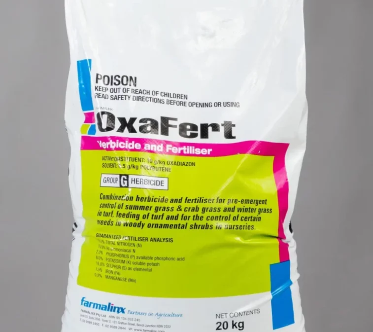 Oxafert is a combination fertiliser and pre-emergent herbicide for the control of many annual grasses and broad-leaf weeds in warm season turf. An application of Oxafert is expected to control germinating weed seedlings for up to 10 weeks. A 20kg bag of Oxafert can cover up to 660sqm.